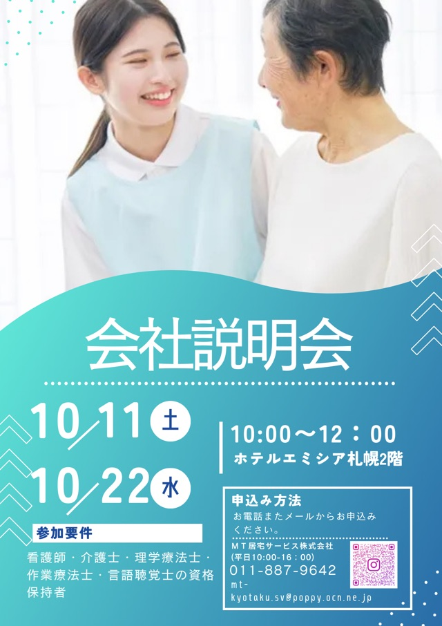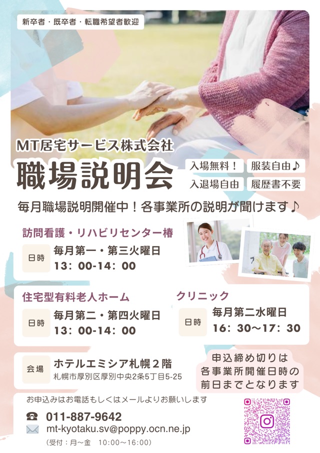 🌸職場説明会のお知らせ🌸 日時:➀2025年9月20日(土) ➁2025年9月24日(水) 時間:各日程ともに10:00~12:00 会場:ホテルエミシア札幌2階 札幌市厚別中央2条5丁目5-25 対象:介護士・看護師・ […]