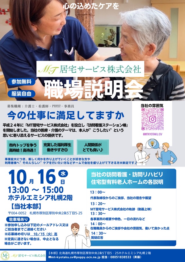 ■勤務地 【本部】札幌ホテルエミシア 札幌市厚別区厚別中央2条5丁目5-25 【各住宅型有料老人ホーム】 北広島市大曲光・朝日町・大曲緑ヶ丘 ※勤務地は面接時に希望をお聞きいたします ※本部や住宅型有料老人ホーム間の異動 […]