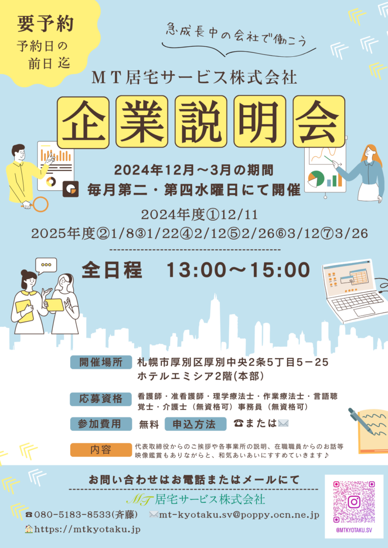 2024年12月~3月の期間 毎月第二・第四水曜日にて企業説明会を開催いたします🌸 詳細はリーフレットをご確認ください🕊🌈🌈✨