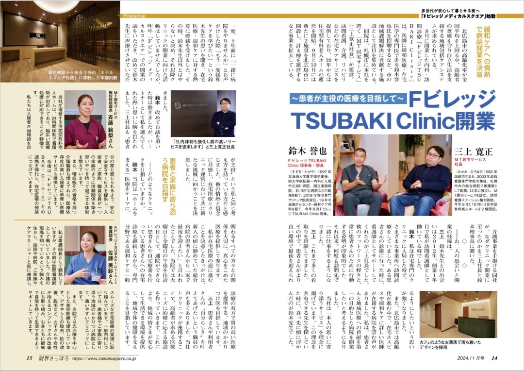 財界さっぽろ11月号 P14~P15 に掲載されました🌸 当社の理念や取り組み、Fビレッシ TSUBAKI Clinic 院長との対談など 貴重な内容となっておりますので是非皆さまお目通しいただければ幸いで […]