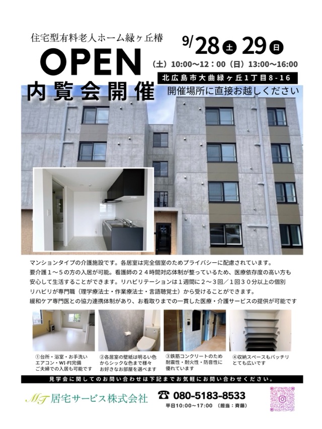 10/1に新規開設となる 『住宅型有料老人ホーム緑ヶ丘椿』の 内覧会を二日間にわたって開催します✨ 入居をご検討されている方 各関連他事業所の方、近隣住民の方など どなたでも内覧が可能ですので 是非ともご来館いただければ […]